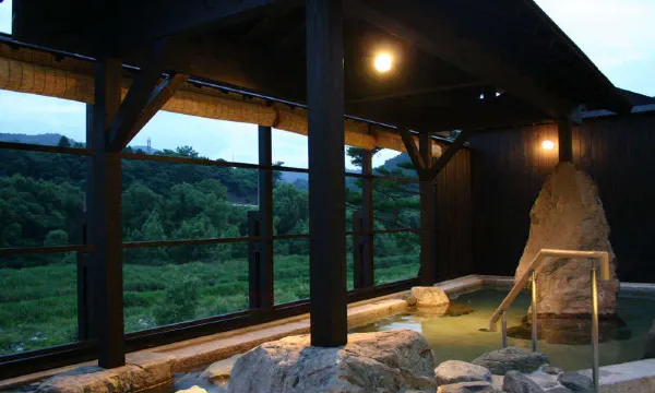 An open-air bath with a view of the Aichigawa river. The quality of the hot spring is also called "beauty water," as it is effective for your skin.