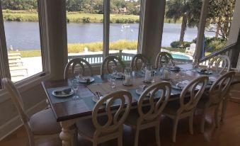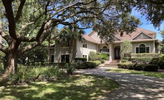 Unwind and relax at BELLA VISTA! This professionally decorated custom home is in a premiere location of Palmetto Dunes Resort. This home boasts breathtaking lagoon and golf views along one of the widest parts of the 11-mile lagoon system and 13th fairway of the Robert Trent Jones golf course. Bella Vista offers the privacy you long for on vacation, yet still only a short walk or bike ride to the beach and amenities of Palmetto Dunes.