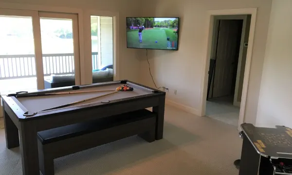 On the second floor, you'll enter a fun bonus room with large tv, pool table, and arcade game. Open the sliders to enter a great escape in the covered terrace. This bonus room separates the 2 upstairs suites, one king and one with two queens. Each suite has a magnificent view, Marriott beds, large walk-in closet and private bathroom, as well as access to the covered terrace. The upstairs terrace is a great place to enjoy your morning coffee, practice yoga, or relax with an evening cocktail.