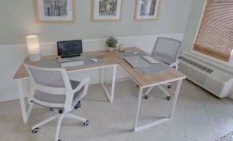 The workspace has two new full-size desks with comfortable office chairs and 440 Mbps Super High Speed WIFI (secured). The desks can be arranged as desired, either straight, L-shaped or together as a dining table.