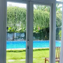 The room is right in front of the pool, and the glass door means you can see right into the room without the curtains. It's perfect for families with young children, as the door opens directly to the pool. There's grass and trees, so there are bound to be bugs. I'm a person who's afraid of bugs and doesn't even go camping...;;;
