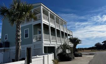 Parking with 2 sides under home for cars and then head to the coral door which leads you to your haven for the week. Choose from one of two bedrooms facing beach or one of the two in the rear (one overlooking pool). Two of the four bedrooms even have a wraparound porch along the entire side of house with northern end overlooking pool. Third level has an open floor concept with half bath/Living Room/Dining Room, Kitchen bar-center island workspace, and large kitchen fully stocked with dishware, glasses, tools, pots, and pans.... a spacious pantry for storage as well. Enjoy the massive front porch on this level with view of ocean or walk around the deck to the covered back porch overlooking pool.