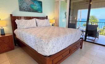 This top-floor, oceanfront condo offers floor-to-ceiling windows and panoramic views that make you feel like you're floating above the waves. Enjoy peace and quiet, refreshing ocean breezes, and stunning sunsets from your private balcony with comfortable teak loungers.