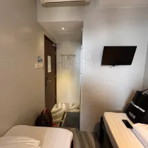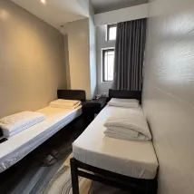The room that we got was much bigger than we expected, but still Hong Kong-style. The bathroom was super small. When you take a shower, everything gets wet. The wi-fi was useless. The bed was ok. The room was clean. They provide adaptors. For one night, it is ok. It is super close to an A21 bus station (airport bus). Check-in review: When you enter the building, there are multiple hotels located within one building. Find the sign with the hotel’s name and the floor number. When you reach the hotel door, there is a cable phone, and you need to call the host, who will then show you to your room.