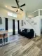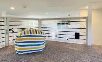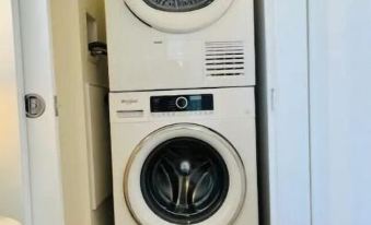 A one bedroom tiny home with a full bathroom. A kitchen, living room, eating area combo space with a smart Tv with Roku mounted on the wall. Bedroom offers a queen size bed with a walk-in closet that houses the washer and dryer. Upstairs spacious loft has a full size bed. Ceiling is low…approximately 4 ft high.