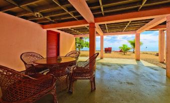 MAIN LIVE SPACE is accessed by Glass French Doors. The wooden Belizean beach-style furniture has thick custom-made cushions on the chairs and for the Futon bed. An HD TV, Internet for WiFi, Large Waterproof Bluetooth Speaker for music includes Karaoke mics, as well as Local Books about Belizean Nature & Culture.