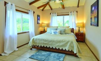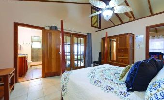 GARDEN VIEW BEDROOM - The Tropical Garifuna-themed bedroom with Garden and Jungle views includes a Queen Bed, an A/C unit, Lighted Ceiling Fan, Full Bathroom, Mirrored Armoire, Laundry Hamper, and Night Stands.