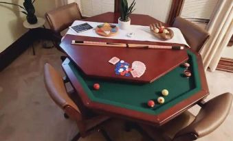 In addition the card table in the game room can seat up to 8 when using the folding chairs you'll find in the closet.About pets:Pets allowed: dogs and cats less than 50 lbs per pet (limit one pet total).About checkOut:Check out before 10:00 AM.About children:Children allowed: ages 0-17.About customRules:NO SMOKING IN THE HOUSE.NO PARTIES. Family friendly gatherings of any size are encouraged. please keep noise to a minimum out of consideration for the neighbors..About checkIn:Check in after 3:00 PM.About smoking:Smoking is not permitted.About minBookingAge:Minimum age to rent: 18.About events:No events allowed.
