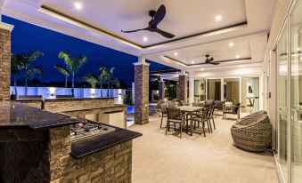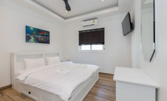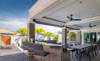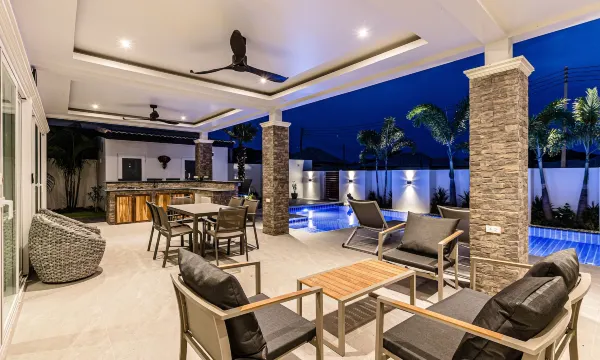 Beautiful private villa. 3 bedrooms, 2 bathrooms, 1 bedroom ensuite. All bedrooms have TV screens, 2 have roof fans, fully equipped European kitchen with kitchen island, the living room has a sofa and a 50" smart TV, 1 roof fan, highest-speed WiFi & TV box from 3BB, air-conditioning in all rooms, outdoor seating & dining area with 2 roof fans, outdoor kitchen/bar with gas burner, automatic blinds to protect you against sun/rain and wind, outdoor toilet, 10x4m saltwater pool, jacuzzi, sunbeds, washing machine, outdoor shower. Parking for 1 car in the carport. All houses have an information folder with wifi name, password, contact details, emergency numbers, and most of the information you need for your stay. On arrival, there are some free drinks in the fridge.