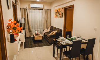 Our living room comes with a comfy sofa and is equiped with a 65" smart TV with Netflix for all your entertainment needs.