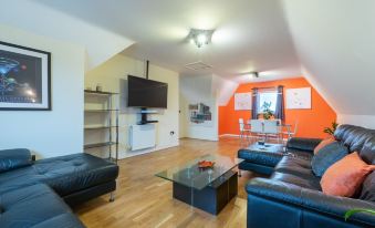 Huge luxury modern penthouse apartment in a quiet part of St. Ives. This two bedroom, two bathroom apartment sleeps 4 and boasts a massive 27ft living room with 2 large sofa's, a 20ft master bedroom with king sized bed and a large kitchen with all the essentials.