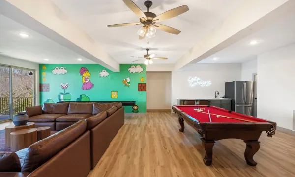 Welcome to our luxurious lakefront retreat for up to 32 guests. Enjoy stunning views, air hockey, pool table, Xbox, and theater seating with a 65-inch TV in our game room. Take a dip in the community indoor pool or soak in our private hot tub. Our fully equipped kitchen and dining area are perfect for meals. Located minutes from SDC, book now for the ultimate lakefront vacation!