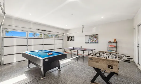 There are plenty of games in the air-conditioned garage including the pool table, ping pong table, darts, and foosball. In the backyard there are fun games that include the putting green, corn hole and ladder toss.