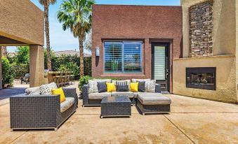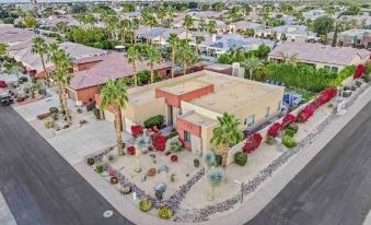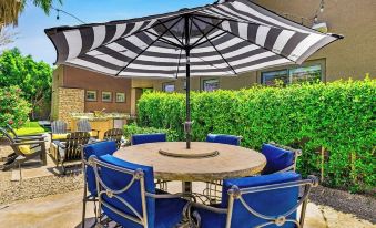 The desert getaway dream home has it all. With three bedrooms in the main house, two of which have their own private bathrooms and the 4th bedroom is a private casita located right off the pool area. There is two indoor dining areas ( the round table can be made into a poker table for all you poker fans) and a kitchen that is stocked for all your vacation/entertaining needs, with two islands to entertain with. The backyard is filled with so much to do and places to relax; two putting greens, two dining areas, fire pit, outside bbq area with a mini frig, bar seating, two patio couch areas, lounge chairs for all, outside TV, fire place, basketball hoop, and the best part a slide to go right into the saltwater pool, and so much more..