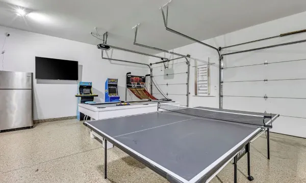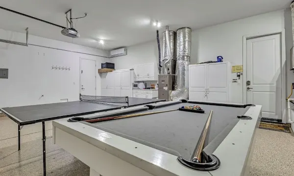 The garage is filled with arcade games, ping pong, pool table, basketball and more. Plus a new EV charger! (Tesla + J1772)