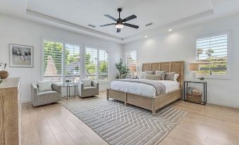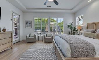 Master Suite: 1 King bed, private en suite bathroom with 2 sinks, walk-in closet, dresser, and a private entrance to the patio