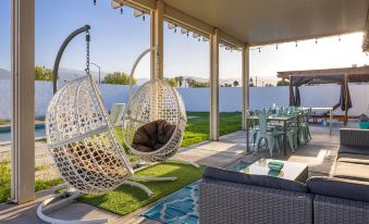 Arrive at Desert Haven with open high ceilings and wall to wall windows. She will welcome you with a bright and open airy concept and over 2000 ft sq of indoor space. Melt away into the new plush furnishings and enjoy the mid century modern glam design. This space has been completely redesigned from head to toe. Cozy up with the newly remodeled fireplace, throw blankets and a good book. Laugh while watching for your favorite movie and tv show on Netflix on the 70” Smart TV. Gather around the designer dining table and modern seating for 10, while making forever memories with family and friends. Enjoy the board / card games, arcade video games or a game of foosball to entertain the whole group.
