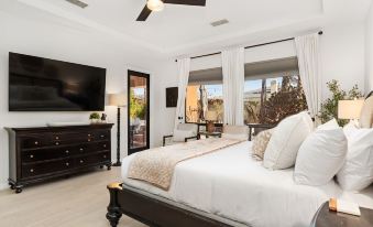 Master Suite: 1 King bed, private en suite full bathroom #1 with 2 sinks, walk-in closet, dresser, attached nursery room (w/ crib and highchair) and a private entrance to the patio