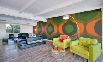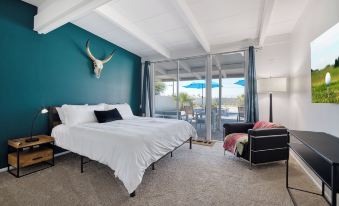 Expansive 5 bedroom funky mid-century modern home with brand new saltwater pool, hot tub, pickleball court and fire pit less than 3 miles from Coachella entrance in the heart of downtown Indio. 6 large beds (1 king, 3 queens, 2 fulls), large dining table, living room and huge backyard oasis. Bold wallpaper, fireplace, decor and design. Ideal location as you can walk or ride bikes to the large events, around the corner from grocery stores and walkable to Starbucks & restaurants.