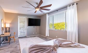 Step into a private backyard oasis designed for sun-drenched days and unforgettable nights. Take a dip in the sparkling pool, lounge under the palms, or sip cocktails at the Tiki bar while the grill sizzles in the background. A lush hedge wraps the space in privacy, creating a serene escape where your group can unwind in style.