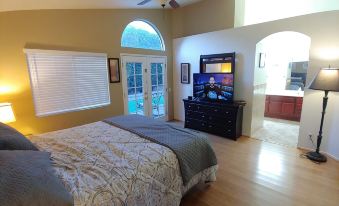 In the master bedroom you will find a king-size bed, large window, and French door to the pool. The master bathroom has a soaking tub, separate shower, walk-in closet, and double sinks. Rooms include master bedroom (king), bedroom two (queen), bedroom three (queen), bedroom four ( full). Laundry in garage.