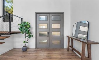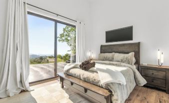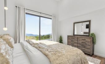 Inside, you’ll find a spacious living area with large windows, high ceilings, and a cozy fireplace. The fully equipped kitchen is perfect for preparing meals, which you can enjoy at the dining table while taking in the stunning vistas.