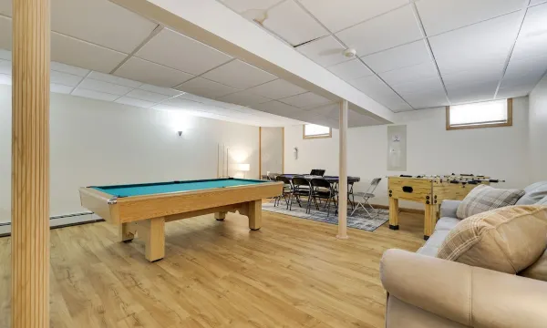 Lower level has a huge game room with a pool, ping pong, foosball, and poker tables. One of the sofas has a queen-size sofa bed, which sleeps 2 guests.