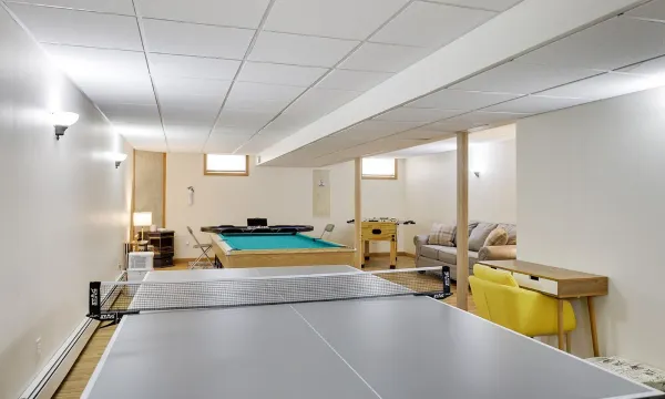 -Game Room with a pool, ping pong, poker and foosball tables, queen-size sofa bed.