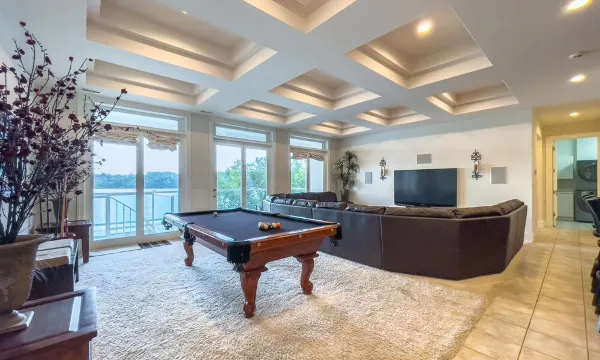 The Pool Level features a 20' by 40' Sports Pool that can accommodate a family game of Volleyball. The pool area has multiple table and chairs for the entire group to relax and enjoy. Across from the pool is a Private Dock featuring a large swim platform, Large Slip 44'x16', Medium Slip 30 x 12' plus JetSki Lift for 3 Personal Watercraft plus a Dock Locker.