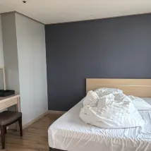The service was good. All the issues were resolved. We were even upgraded to a two-bedroom, one-living room suite. The room was on the third floor and didn't have a sea view, but a higher floor should be fine. The room had a kitchen and cutlery (we didn't need it, but those who like to cook can). The hotel lobby is on the fourth floor. There's BBQ fried chicken in the lobby, which we ate for dinner two days in a row. Hamdeok Beach is a five-minute walk away, with many cafes and restaurants. There's a convenience store and specialty shop in the hotel lobby. The facilities are good, giving it the feel of a traditional four-star hotel. The room was large, a bit old, but the hygiene was acceptable. Four hotel sauna tickets were given upon check-in, which was nice. However, there were no English signs in the sauna, so you had to guess. You had to wrap your head with a towel to enter the sauna, and there were no disposable shower caps.
