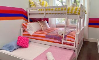 2 bedrooms: 1 bunk bed 1 single bed 1 queen bed and 1 double bed