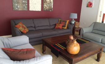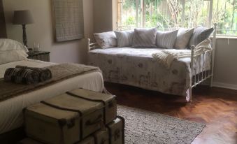 This beautiful home has just undergone a re-vamp. Wooden floors re-finished, entire house re-painted, brand new kitchen, bathrooms updated, etc. The rooms are huge, use it as a work space (pop-up showroom, etc) or to just escape into a corner and enjoy the quiet. You will wake to the singing of the birds, we have about 14 species visiting everyday. The yard is great for kids to run around in, have a dip in the pool & lunch outdoors in the thatched lapa. Whatever you are looking for, you will probably find it here.