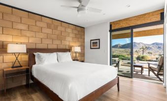 The villa holds three lovely bedrooms that ensure rest and relaxation. Each features a pristine white color palette accented by warm desert hues, plus outdoor access and striking desert views through floor-to-ceiling glass doors. The villa's two full bathrooms are outfitted with exquisite tilework and premium fixtures.