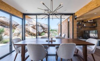 Discover a secluded Joshua Tree getaway that will make you feel as if you're staying right in the national park. Featured in Condé Nast Traveler, On the Rocks is a dreamy, artistic retreat that draws on the iconic architecture of nearby Palm Springs, tastefully blending modern minimalism with classic Mid Century style. The villa is tucked up against dramatic boulders and beautifully integrated into the landscape, creating enchanting indoor and outdoor spaces for you and your group to enjoy.