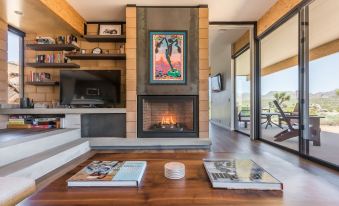 The entire home is designed to take in the magic of the high desert. Gaze out across panoramic views through the sleek glass walls that wrap around the building, take in stunning sunsets from the hot tub, and spend nights around the firepit under the stars. The gorgeous chef's kitchen, massive island, and full dining table allow for memorable group meals, while the inviting living room and outdoor lounge areas are perfect for unwinding.