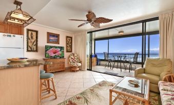 whales during season in Maui. As you enter the condo you will be amazed by the open tropical feeling and panoramic ocean view. This unit is located on the second floor, so if you prefer, you don't have to wait for an elevator. There's ample free parking on the property. The condo has a fully stocked kitchen with granite counter tops and cooking Island , a hotel style safe, high-speed Internet with free Wi-Fi, free , 46' Samsung Flat Screen Cable TV with a HD DVR plus a Sony multi-region DVD Player.