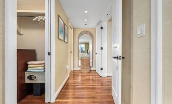 The master bedroom includes a king-size bed equipped with a large walk-in closet and flat screen TV for ultimate relaxation as well as blackout curtains. Wander into the master bath for a mesmerizing soak in the large marble tub. Guests can also enjoy a separate shower, a private lavatory and double vanity counter with stunning marble countertops.