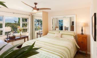 Beautiful views from the lanai of the swimming pool and the lagoon and beach. Living area was very comfortable. Bedrooms had plenty of storage, and bathrooms were beautiful, especially the master bath with the open stone shower. Mirrored medicine cabinets opened and were lighted. Amenities include shampoo, body wash, kitchen spices, 4 beach chairs and towels and snorkel set. Washer and dryer had soap and dryer sheets. Onsite ocean view Indian restaurant had delicious food and wonderful sunset views. Free parking, central location.