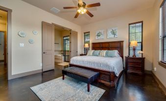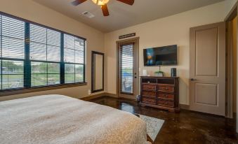 First-floor primary suite with king bed, private bath, beautiful lake view, and patio access.