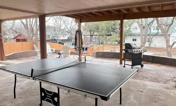 A covered entertainment area under the house with seating, ping pong table, barbeque grill, and fire pit is perfect for any weather. Rain or shine the patio is a great place to hang out and enjoy the day or cozy evenings.