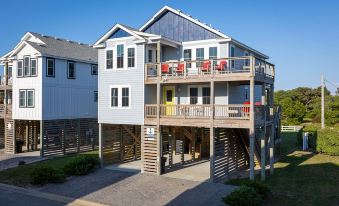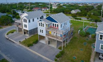 Nauti-Dog located in a private harbor neighborhood, with views of the sound and harbor with stunning sunsets. And since the island is so narrow, you can see the beach from our balcony! Nauti-Dog has four bedrooms and sleeps 11, with several levels of decks with views of both the sound and the ocean. Enjoy modern, comfortable furnishings. The first floor features a king bedroom suite facing the sound. Another king bedroom shares a bath with a bunk room (twin over queen bed). This house has a media room with queen sleep sofa. The top floor features an additional king bedroom suite, as well as a living room, dining room and gourmet kitchen. Spacious granite countertops, appliances, and pantry complete the fully equipped kitchen. Enjoy beautiful views from the living room or share a meal on the deck facing the sound. Nauti-dog includes access to all the amenities of Black Dog Harbor, including a boat ramp, boat slip, basketball hoop and has their own cornhole game. Enjoy fishing, kayaking/paddle boarding/boating (bring your own or rent from local establishments) from the harbor, dock and head down to the gazebo at sunset for to take in the sunsetting across Pamlico Sound. Salvo is quite narrow, so while you'll be overlooking the sound, the beach is only a quarter mile away, a short walk or bike ride, or pack your car with chairs and a cooler and park near beach access or drive your SUV on the beach.