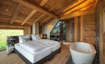 The completely newly built wellness area has about 45 m2 with a whirlpool/jacuzzi for 4 people, a spacious sauna and a spacious shower area, own WC and sink. The relaxation area with loungers and a stereo system provides for romantic relaxation after a long ski day.
