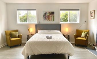 The lower level features a studio with its own separate entrance, a fireplace, queen bed and small kitchen. The lower level also includes a bathroom with a standup shower and a washer and dryer for your convenience.