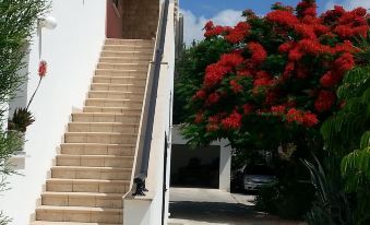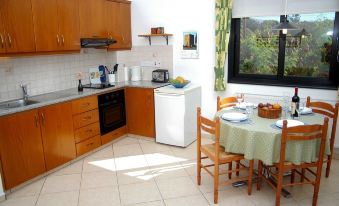 Our 90 m2 apartment is spacious, decorated in warm colors and is very open with its high, sloping ceiling. On the 15 m2 large veranda there is a 6-seat dining table, and enough space to read on the recliner. The view upon your own garden seats with pool and exotic flora invites you to swim or just relax. The living room has an integrated, well-equipped kitchen with a round, the insert at two windows dining table. The stereo and the TV set have a satellite antenna with English, German and Swiss programs. The bedrooms are spacious, the beds are stable with orthopedic mattress and the fitted wardrobes, there is plenty of room to stow everything they need. The terracotta tiles are decorated in warm yellow, the cabinets cherry wood color. Cleaning & linen change 1x per week are free. Only beach towels must be brought along.