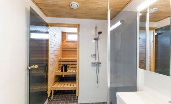Living room/kitchen with sofa bed (extra beds), bedroom with two beds, bedroom is separated by sliding door, sauna and washroom/WC.