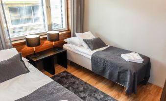 Livingroom / kitchen with aorner sofa, which can be converted into beds for 1-2 people if needed (mainly for children), three bedrooms, one with double bed and others with two single beds. One of the bedrooms is on the upper floor, access to balcony from this room. Sauna and living areas are also located on the upper floor. Upstairs living area is equipped with sofa bed, for 1-2 persons, light fireplace, kitchen with sink, fridge and cupboard. There are two WCs in the apartment, shower also in downstairs within the WC. Another is upstairs in the sauna area.