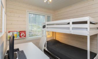 The ground floor features two bedrooms, one with a comfortable double bed and the other with a bunk bed. The open living room/kitchen creates a warm and inviting atmosphere, and the well-equipped kitchen allows you to prepare delicious meals.
