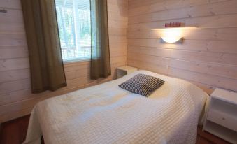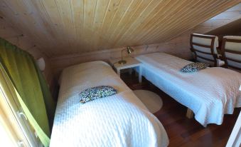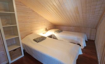 40 km north-east of Kolari, lake Ylläsjärvi 4 km, swimming beach 4,5 km. Log duplex apartment, built 2009. Livingroom/kitchen, one bedroom with double bed and blinded curtains in the windows, loft with 4 separate beds, electric sauna, shower/toilet (sauna and bathroom renovated in 2023).