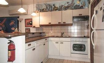Fully furnished kitchen with all the conveniences of home – stainless steel double sink with Grohe sprayer/faucet, ceramic cook-top, oven, dishwasher, full–sized refrigerator, blender, coffee maker, electric kettle, microwave, toaster, Wolfgang Puck pots&pans, dishes, glasses, flatware