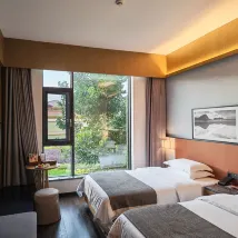 The hotel is brand new. The rooms are spacious and offer beautiful views. The swimming pool is clean, though the lanes are a bit short. On the second floor, there's a complimentary floral tea tasting area with a pleasant ambiance, perfect for reading and relaxation. The evening congee (porridge) with shredded pork and mushrooms was delicious, and the breakfast selection was extensive.